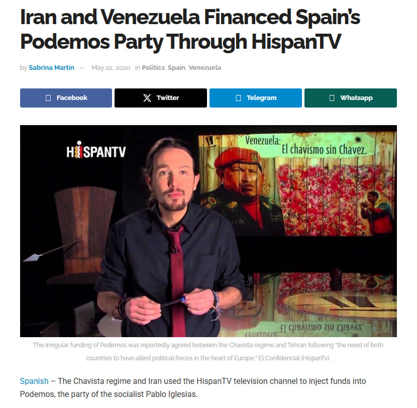 In Spain, the Iranians helped boost notorious communist, Pablo Iglesias, founder of Podemos, by bringing him on as a paid host of HispanTV, an Iranian funded channel.