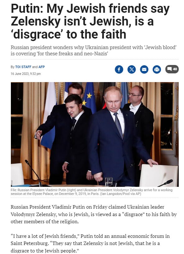 2) Putin is not Jewish and his stated motives for the war are principally geopolitical (stopping Ukraine from furthering its ties with NATO; preventing Ukrainian nationalists from gaining more power; expanding Russia's power; none of that is Jewish or Israel related).