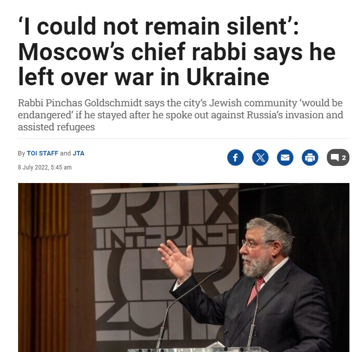 8) Most Russian Jews are against the war; a professor estimated that "around a third of Jews living in Russia are currently “actively” expressing their opposition to the war; most “aren’t happy” with the situation, but are too scared to speak out. He estimates that only 10 to 15 percent of Jewish people in Russia support the war"; Moscow's chief rabbi Pinchas Goldschmidt vocally opposed the war and then fled the country.