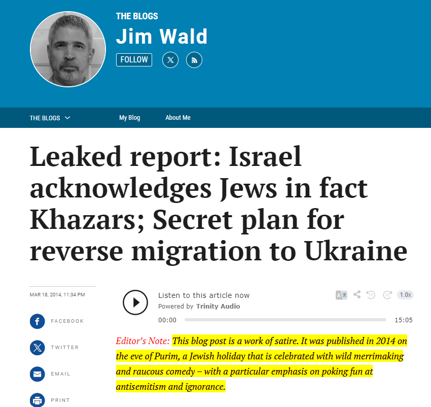 Much of the meme nonsense about Jews establishing a "second homeland" in Ukraine comes from a satirical article on the Times of Israel website that kooks took literally.