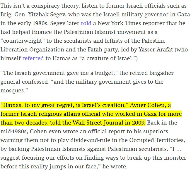 It is becoming common knowledge that Israel, when it was governing Gaza in the 80s, provided financial and other types of support to Hamas as a way to split the West Bank and Gaza and prevent the emergence of a unified Palestinian state.